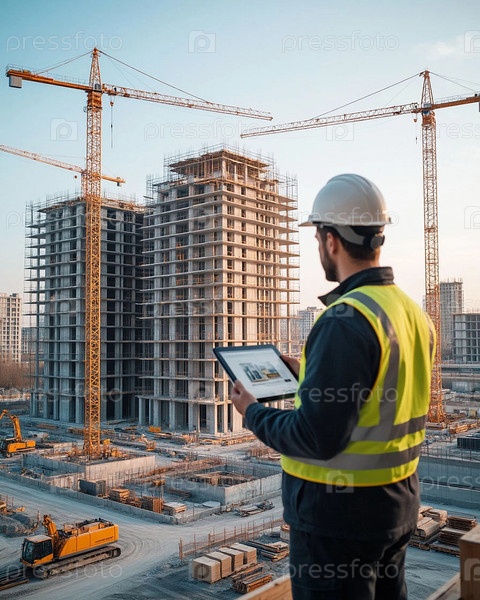 Инженер на строительной площадке осматривает высотные здания и краны с планшетом