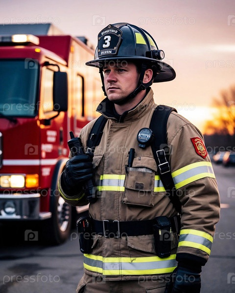 Пожарный в защитной форме рядом с красным пожарным автомобилем на закате