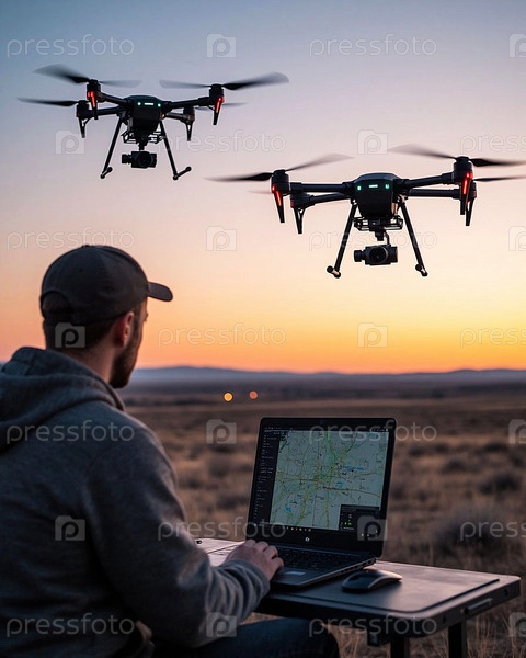 Оператор управляет промышленным дроном с ноутбуков на фоне заката в поле