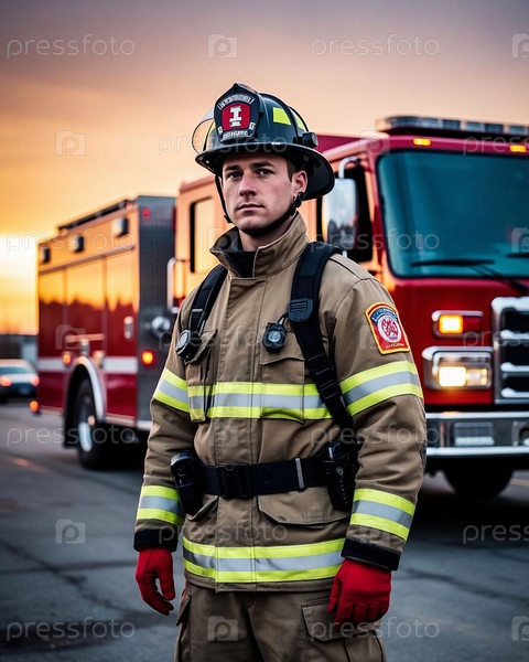 Пожарный в защитной форме рядом с красным пожарным автомобилем на закате