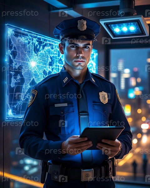 Полицейский в форме с планшетом на фоне цифровой карты