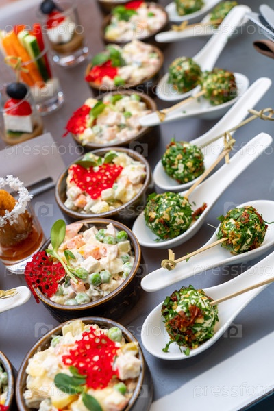 Ассортимент гурманских закусок, овощных палочек и салатов