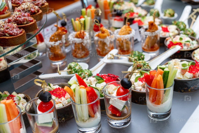 Апетитные блюда для гурманского питания с овощными выстрелами, островками из сыра, каннапусами мясного тартара и салатными мисками на банкетном столе-буфете