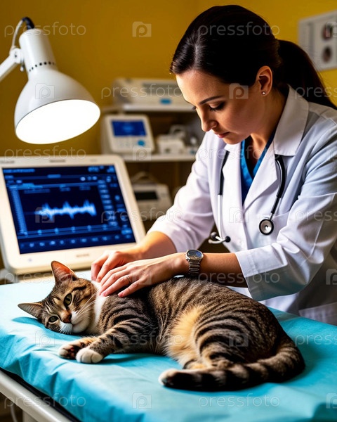Ветеринар осматривает домашнюю кошку в современной ветеринарной клинике