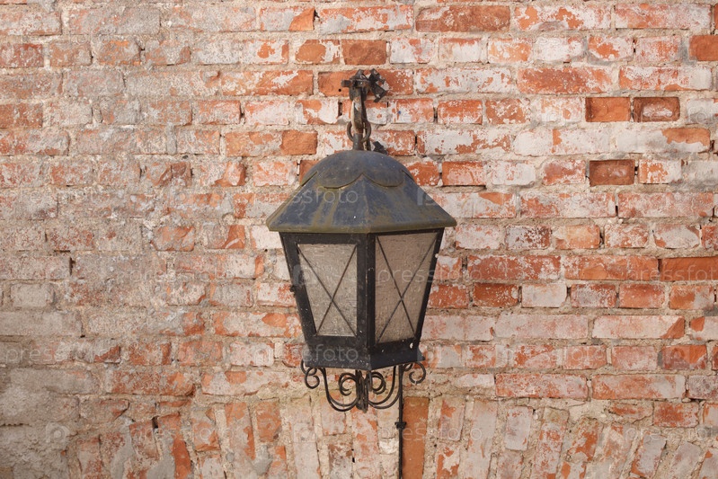 Винтажный черный металлический фонарь, висящий на выветрившейся красной кирпичной стене с белым раствором.Рустикная наружная светильница со стеклянными панелями и декоративным свитком
