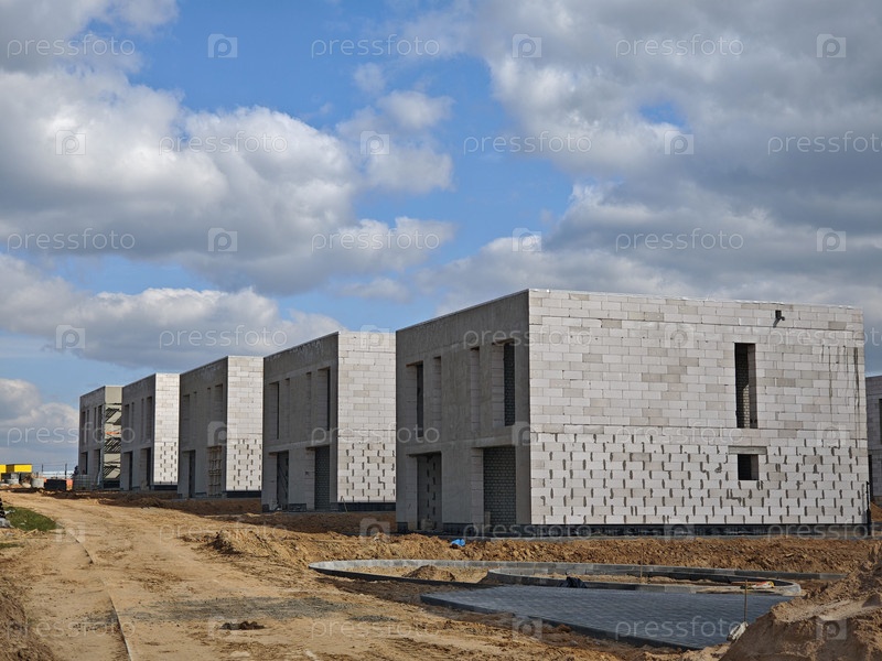 Ряд незавершенных домов, построенных из белых бетонных блоков