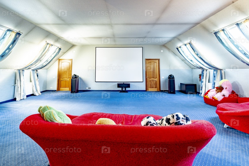 Интерьер гостиной с домашним кинотеатром в современной квартире