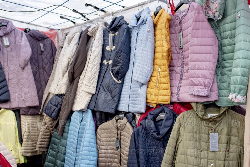 Лоток с одежной и аксессуарами на рынке. Москва