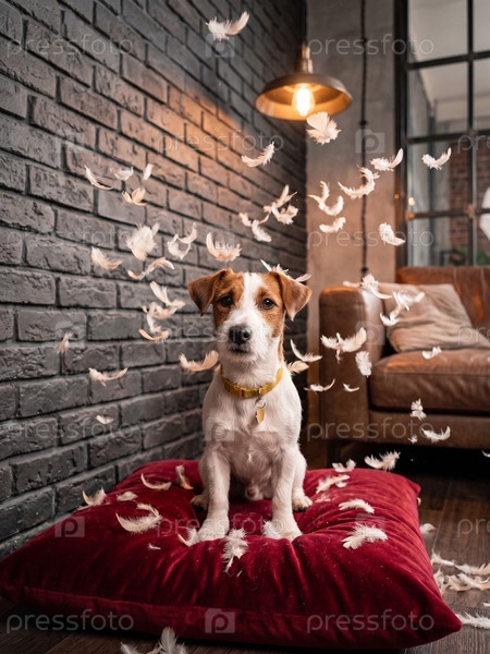 Собака породы джек рассел терьер сидит в стильном помещении лофт среди летющих вокруг перьев