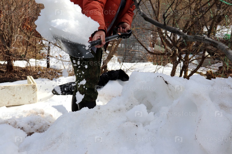 Садовник чистит снег под яблоневым деревом в весеннем саду