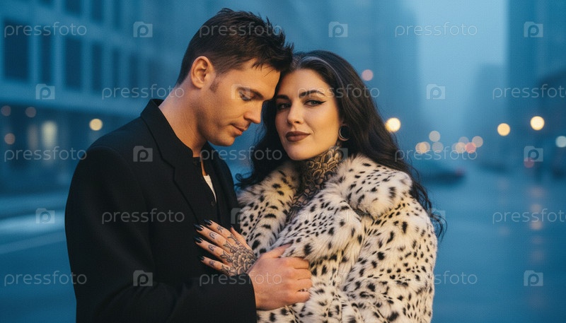 Девушка в леопардовой шубе обнимается с парнем на улице в сумерках