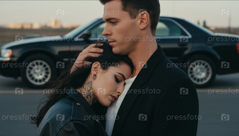 Девушка трогает мужчину за шею на фоне машины в пасмурный день
