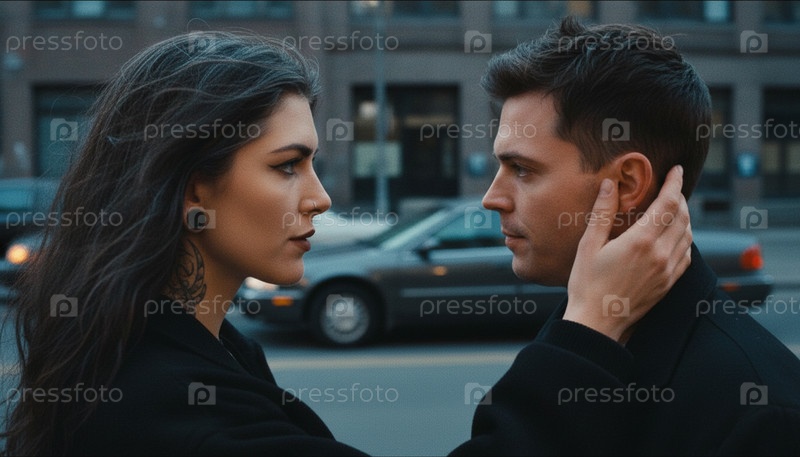 Девушка трогает мужчину за шею на фоне машины в пасмурный день