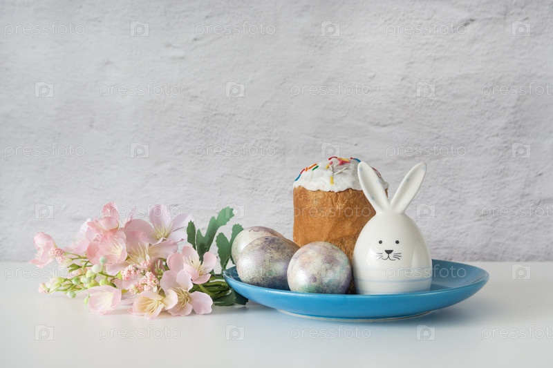 Минималистический пасхальный натюрморт с традиционным тортом, окрашенными яйцами и милым керамическим кроликом на синей тарелке