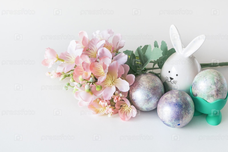 Грациозный пасхальный натюрморт с серебряными и синими мраморными яйцами, милым белым керамическим кроликом и букетом розовых весенних цветов.Элементы расположены на белом столешнице против нейтральной текстурированной светло-серой стены, создавая чистую