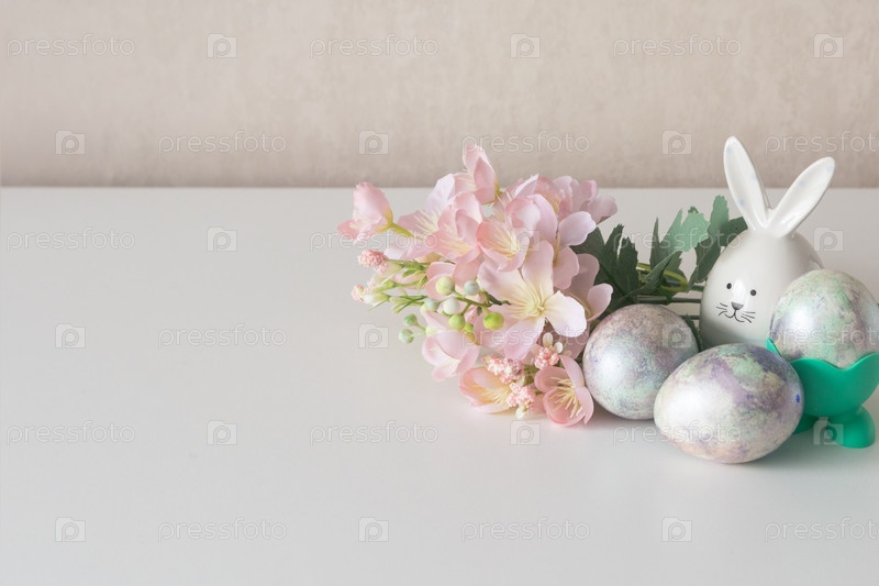 Минималистическая композиция весенних праздников с пасхальными символами и розовыми цветами на белом столе