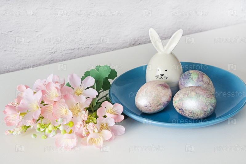Минималистическая композиция весенних праздников с пасхальными символами и розовыми цветами на белом столе