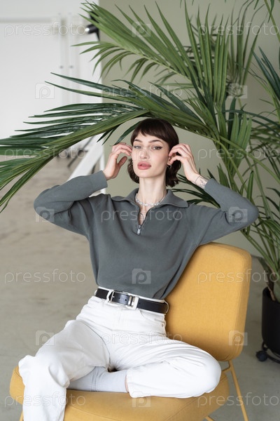 Портрет молодой красивой женщины в студии, сидящей на желтом стуле