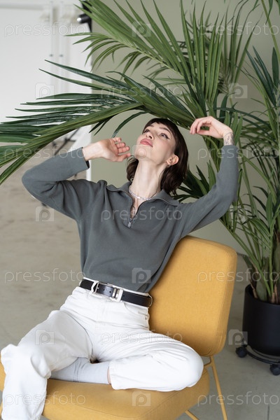Портрет молодой красивой женщины в студии, сидящей на желтом стуле