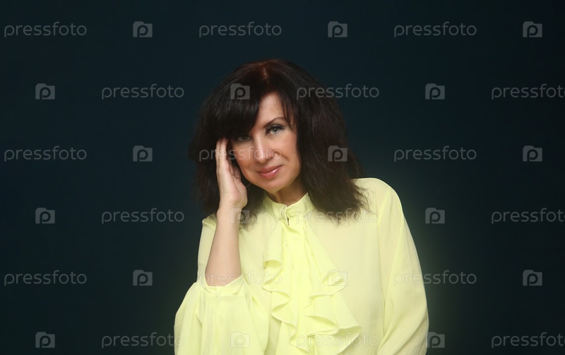 Милая девушка улыбается и позирует в желтой блузке на синем фоне