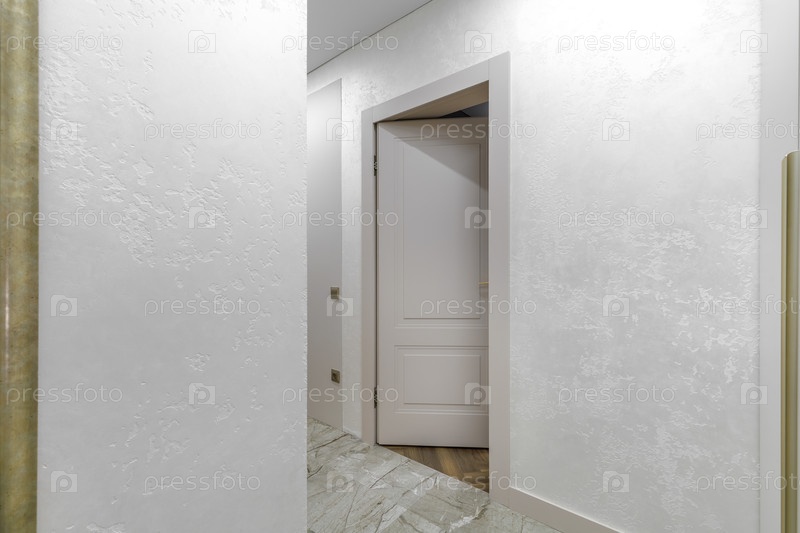Яркий коридорный интерьер с слегка распущенной белой дверью с классическими панелями.Минималистский дизайн подчеркивает белые текстурированные гипсовые стены и мраморные напольные полы, демонстрируя глубину и элегантность современной жилой квартиры