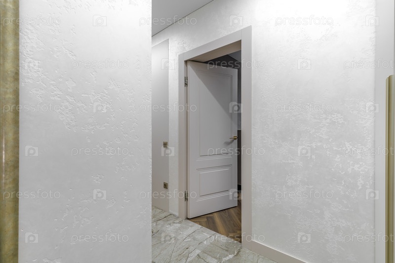Яркий коридорный интерьер с закрытой белой дверью с классическими панелями.Минималистский дизайн подчеркивает белые текстурированные гипсовые стены и мраморные напольные полы, создавая чистое, организованное и элегантное жилое пространство