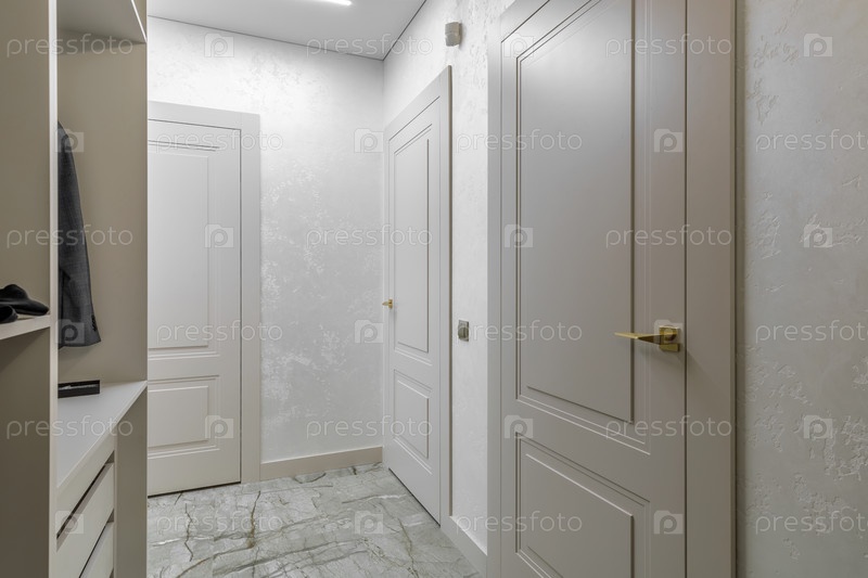 Интерьер яркого жилого коридора с белыми классическими дверями со золотыми ручками и встроенной открытой системой гардероба.Дизайн демонстрирует белые текстурированные стены, высококачественные мраморные полы и минималистическое потолочное освещение