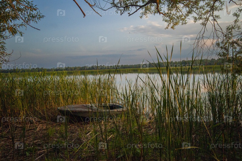 Старая лодка в зарослях камыша на берегу реки на закате