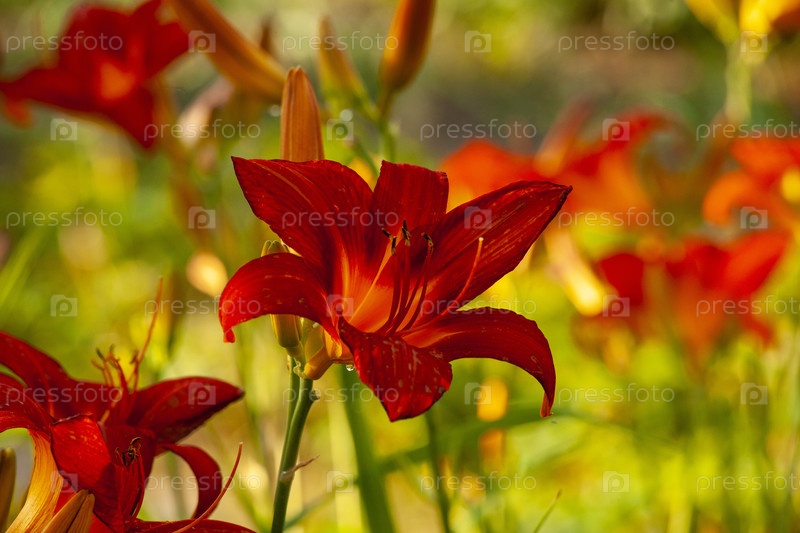 Яркий красный лилейник с каплями росы на лепестках