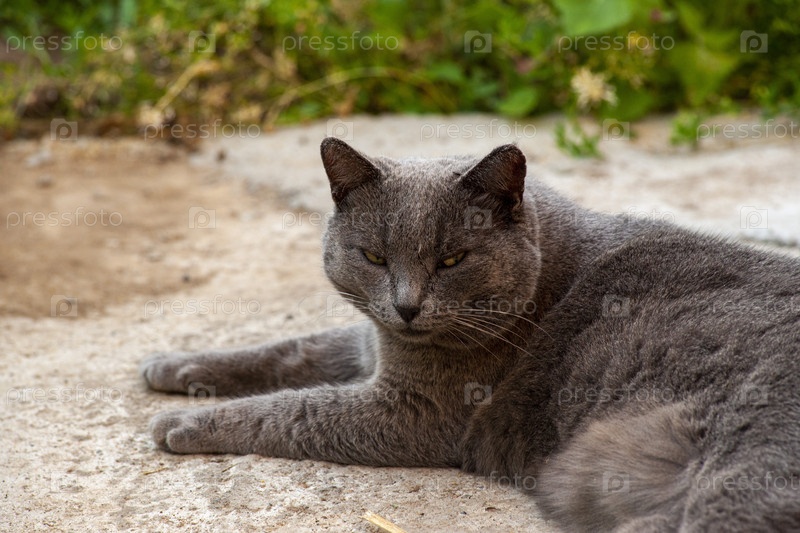 Портрет серого кота на улице