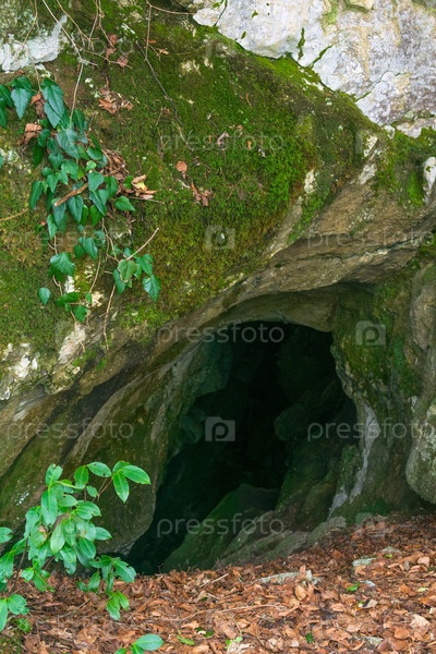 Каменная пещера в лесу с зеленым мхом и упавшими листьями на земле