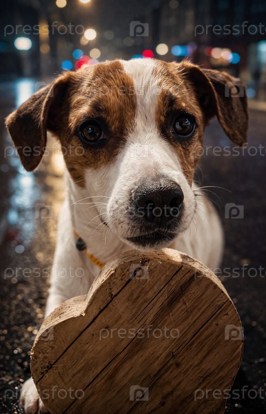 Собака породы джек рассел терьер лежит под дождем в ночном городе. портрет. крупный план