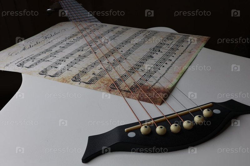 Гитара с винтажными сгоревшими нотами на черном фоне