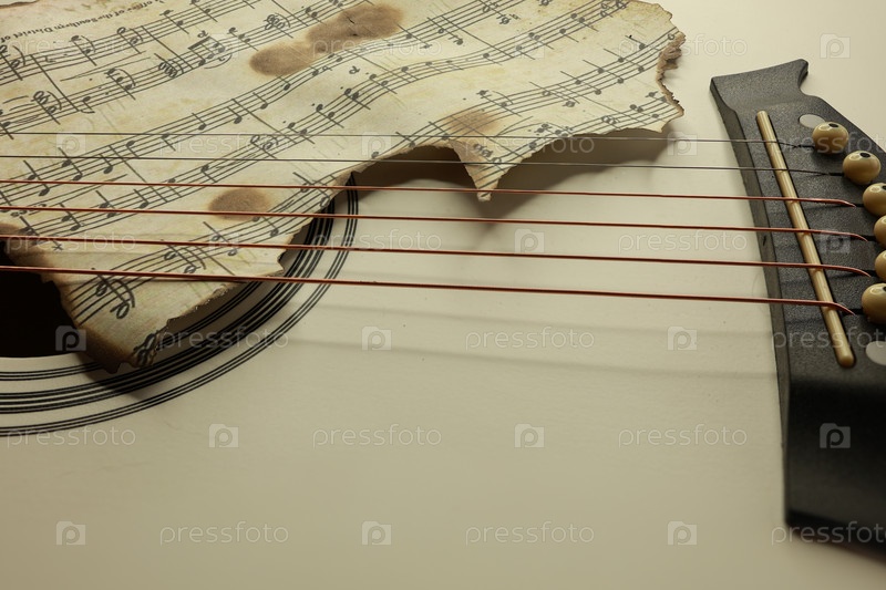 Гитара с винтажными сгоревшими нотами на черном фоне