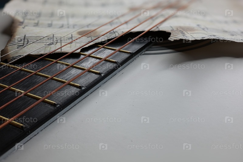 Гитара с винтажными сгоревшими нотами на черном фоне