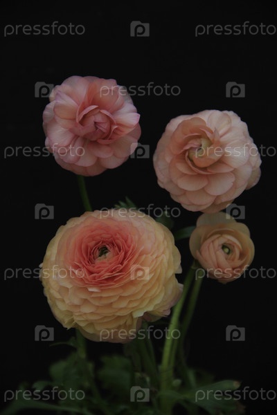 Четыре бутона ранункулюсов разной степени раскрытия на черном фоне, крупный план