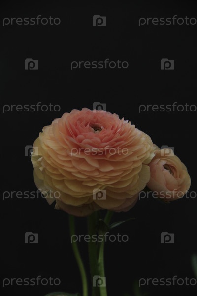 Два бутона ранункулюсов на черном фоне: полностью раскрытый и полузакрытый