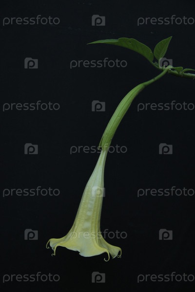 Раскрывшийся бутон Бругмансии желтой с цветоножкой и листом на черном фоне