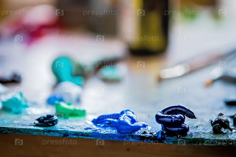 Художественная палитра с трубкой масляной краски и кистью. Красочные пигментные пятна на деревянном доске для масляного рисунка. Творческий инструмент рабочего пространства студии для любителей и художников. Искусственные предметы ремесла