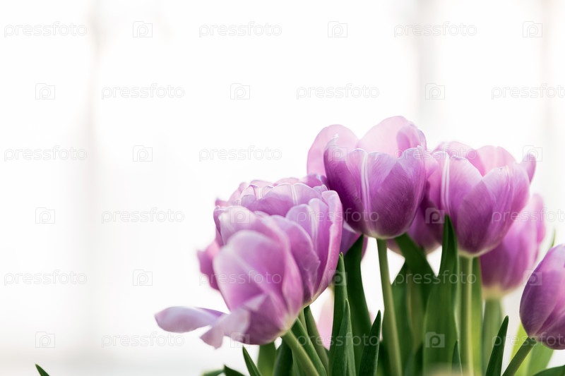 Букет фиолетовых цветов тюльпанов на белом фоне.Весеннее цветение растения для дизайна поздравительных открыток.Цветочное украшение с копировальным пространством для празднования, свадьбы, дня рождения и Дня матери мероприятия