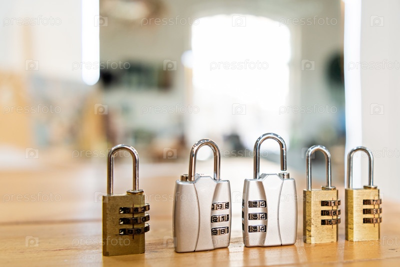 Комбинированные замки стоящие на деревянном столе. Концепция безопасности и защиты. Металлические замки с цифровым кодом для охраны частной собственности, безопасность и решения конфиденциальности данных