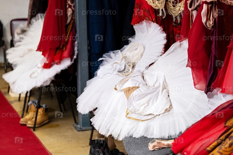 Белые тутусы и красные костюмы на стульях с наружной обувью под ними в театральной раздевалке