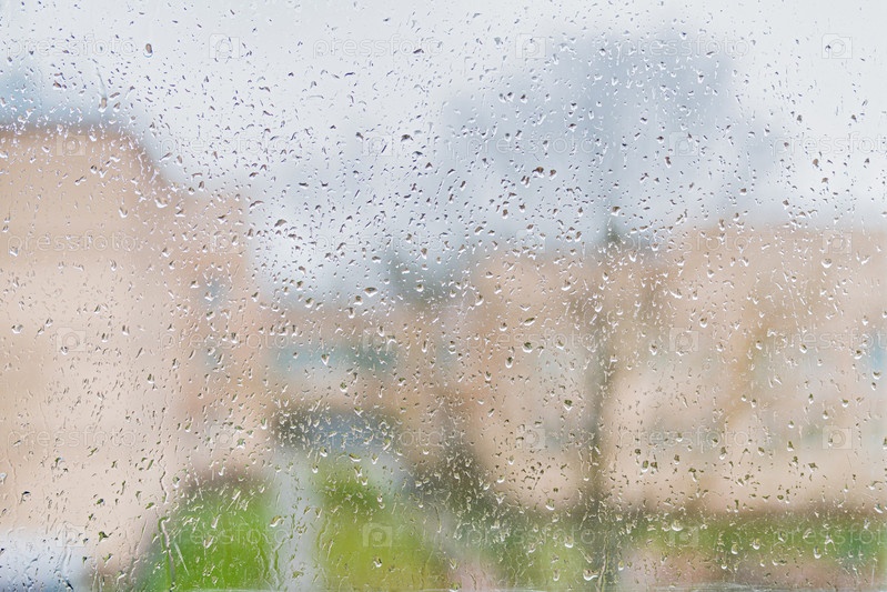 Капли дождя на поверхности стекла окна. Размытый вид домов и деревьев на заднем плане. Концепция погоды с капельками воды на панели. Модная осенняя сцена дня с влажной текстурой окон для дизайна