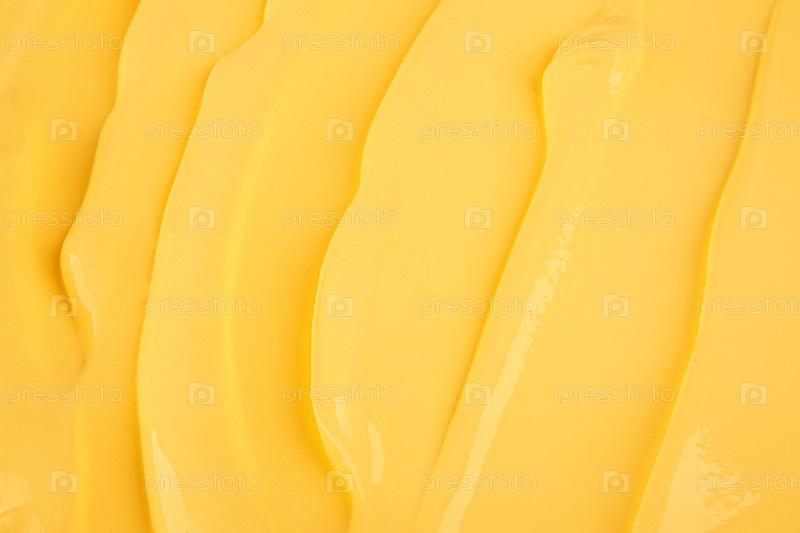 Образец текстуры тонкого желтого крема для банановых кондитерских изделий. Мягкие волны сливочной поверхности фруктового бананного крема для выпечки пирожных. Вид сверху. Копировальное пространство