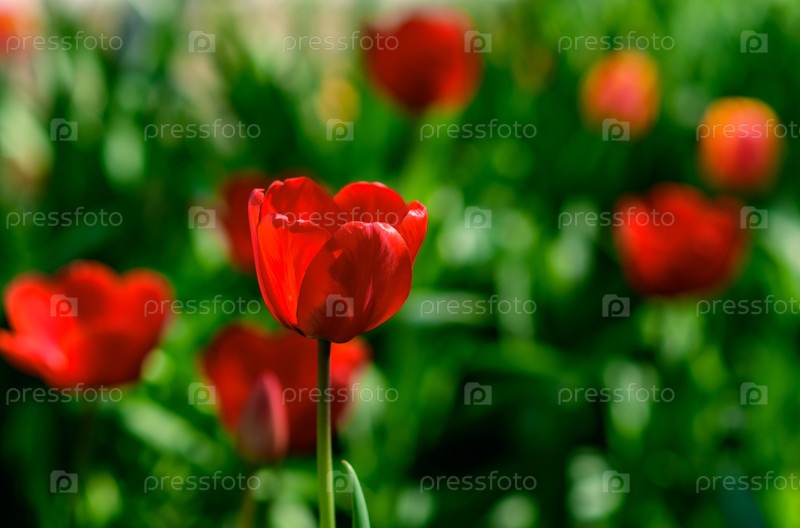 Красные тюльпаны на зеленом фоне. Цветочный фон, выборочная фокусировка на красном тюльпане. Весенние цветы
