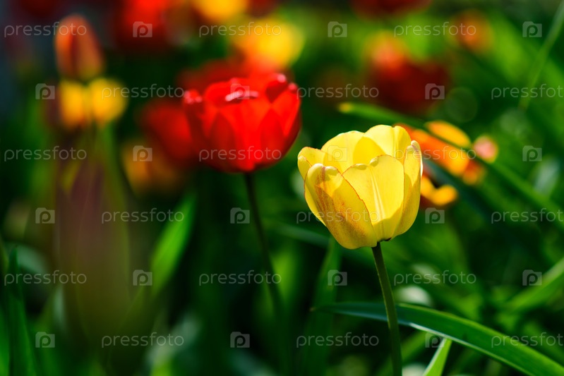 Желтый тюльпан.Тюльпаны на зеленом фоне.Цветочный фон, селективный фокус на желтом тюльпане