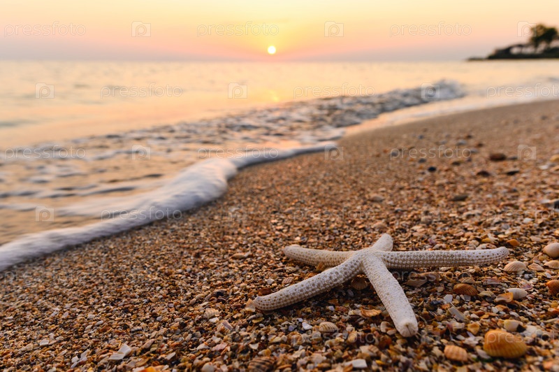 Морской пейзаж с морской звездой. Красивый теплый закат. Выборочный фокус на морских звездах