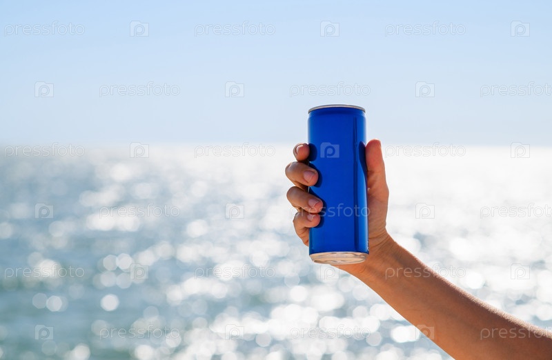 Синяя алюминиевая банка с холодным напитком в жаркий летний день