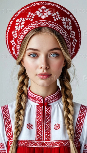 Красивая девушка в традиционном русском национальном костюме с кокошником на голове. Портрет символизирует традиции и красоту русского народа