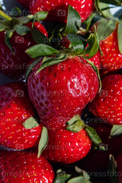 Спелые сочные красные ягоды клубники. макро. фон продукта. обои. почти вертикальный вид. ближайший